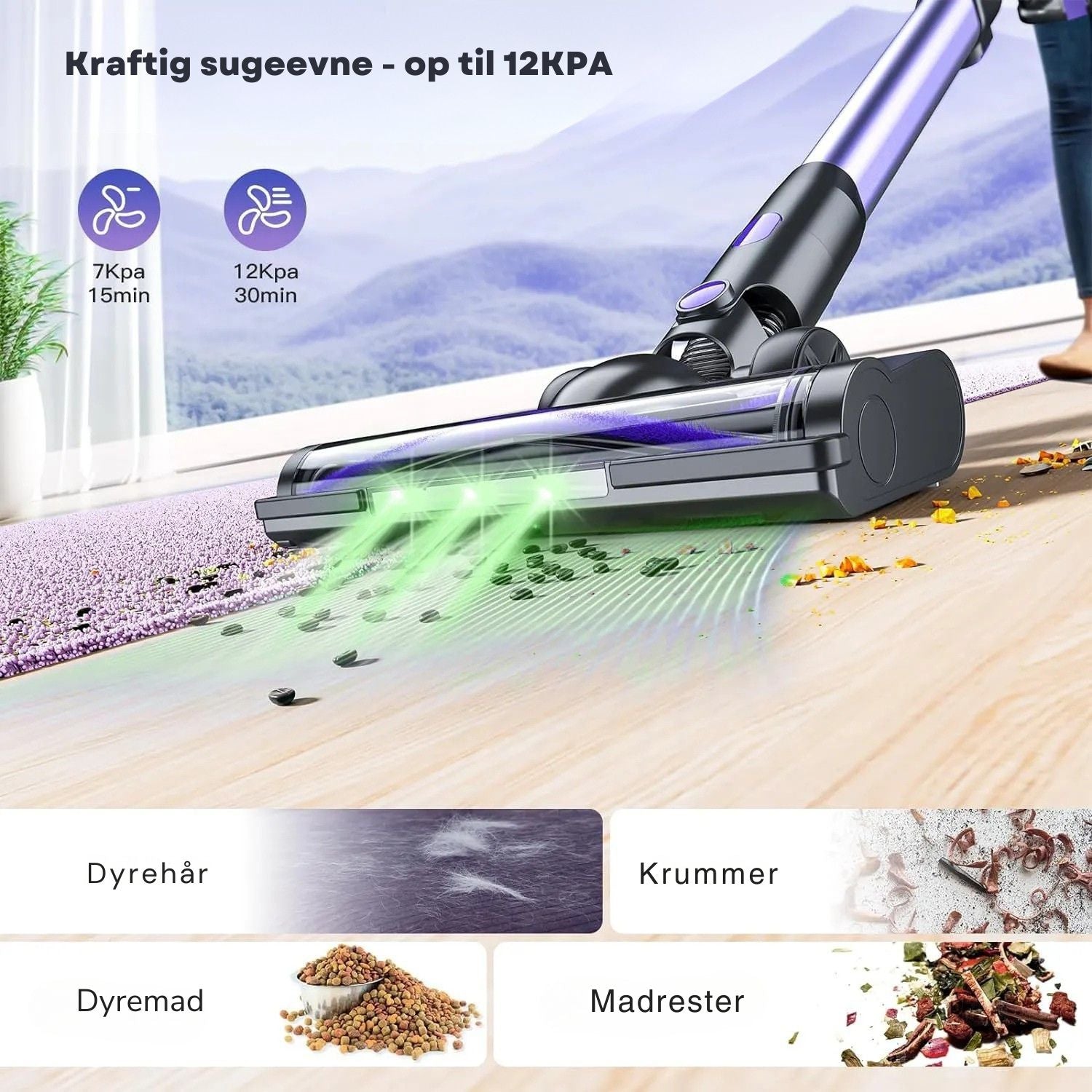 Støvsugeren bruger et genopladeligt batteri til at give dig op til 30 minutters rengøring pr. opladning. Den har et motoriseret gulvhoved med LED-lys, så du også kan se støv og snavs under møbler og i mørke hjørner.
