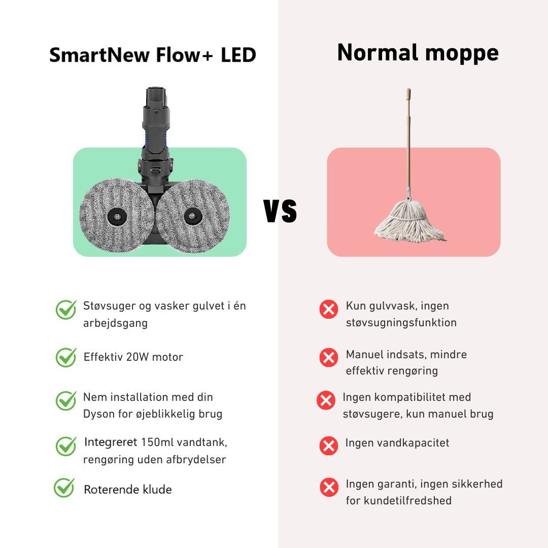 SmartNew Flow+ LED forvandler din Dyson støvsuger til en kraftfuld elektrisk moppe, der effektivt rengør dine gulve. Denne innovative løsning kombinerer støvsugning og gulvvask i én arbejdsgang, hvilket sparer dig tid og kræfter. Med en let og hurtig tilslutning og en aftagelig 150ml vandtank, bliver rengøringen enkel og effektiv. Se resultatet ved brug af vores støvsuger og oplev renere gulve og en lettere hverdag med SmartNew Flow+LED.